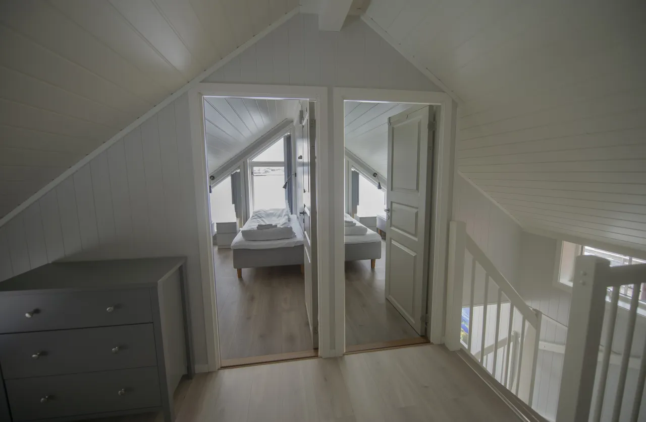 Ett soverom har dobbeltseng (150 cm), mens de to andre soverommene har to enkeltsenger (90 cm) hver. Denne løsningen gjør hytten ideell for familier eller vennegrupper, og gir både god komfort og privatliv under oppholdet.