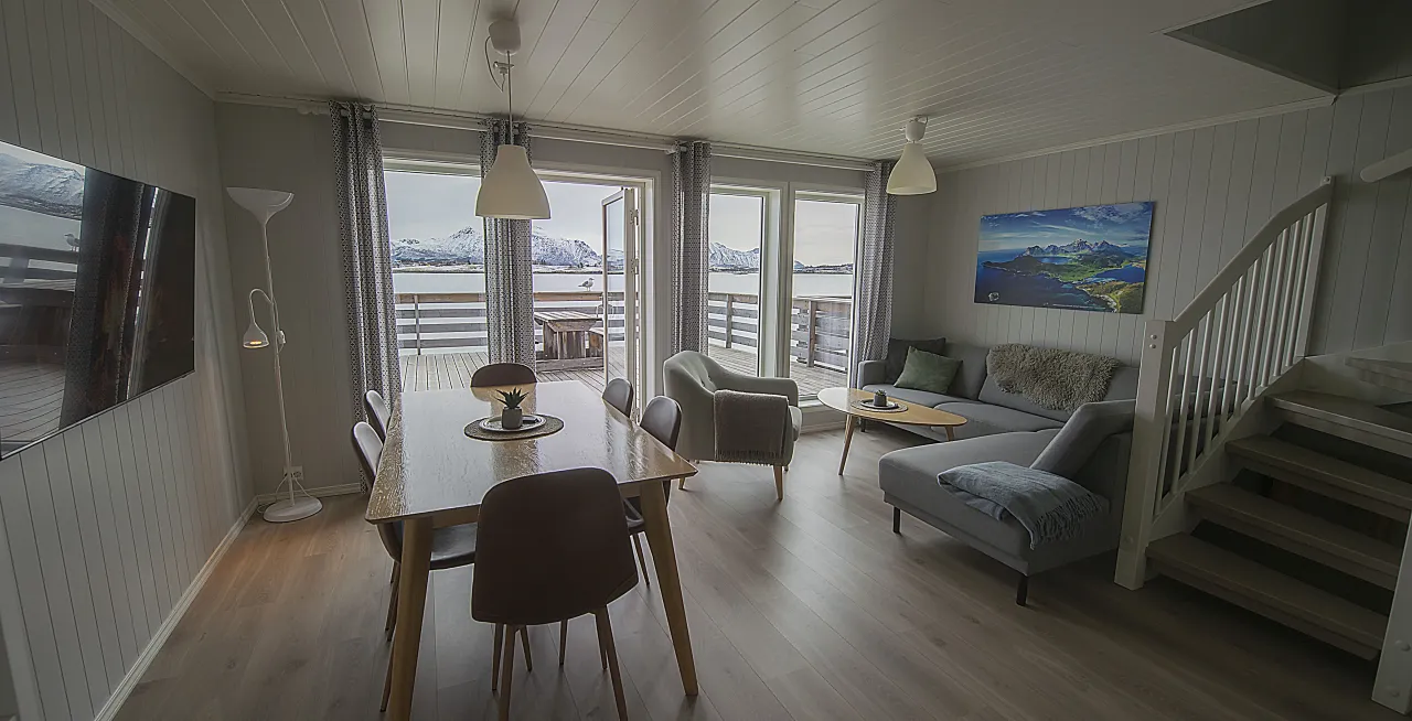 Stuen er et innbydende og komfortabelt oppholdsrom, med god sitteplass og stor TV. Herfra har du direkte utgang til den romslige terrassen, hvor du kan nyte frisk sjøluft og fantastisk utsikt – perfekt for avslapning og rolige kvelder.